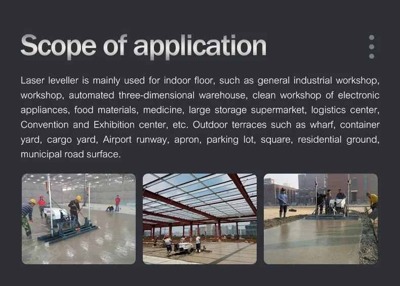 Laser leveling machine is used in large areas of concrete construction, such as a workshop, supermarkets, warehouses, airports, playgrounds, etc. Laser leveling machines can meet the construction requirements of large areas and high flatness.