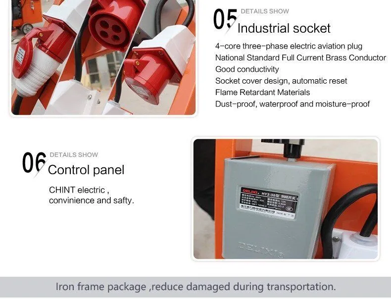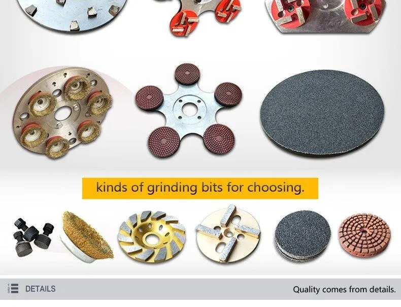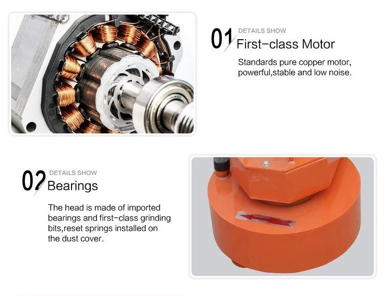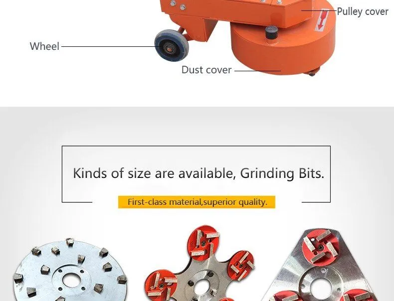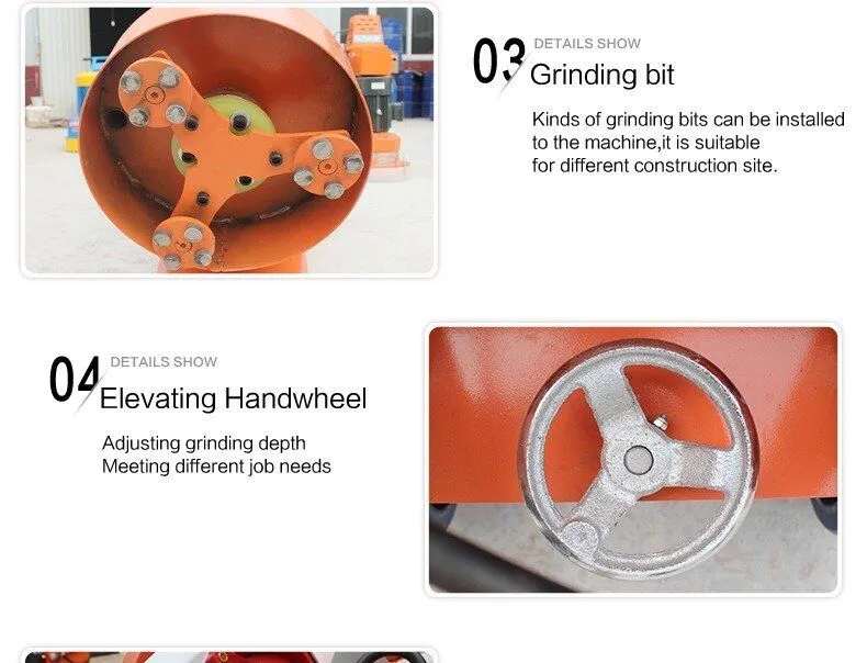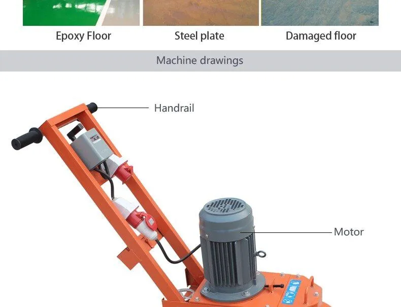Mainly used for ground polishing on large or medium roads. It can grind the concrete surface layer and epoxy mortar layer. Equipped with a vacuum cleaner power socket, the power cord of the vacuum cleaner can be directly connected to the grinder. Avoid the need for two power cords when working. The edge of dust can be polished, and the surface of concrete can be effectively polished. While ensuring the flatness of the ground, it also improves the adhesion between the material and the ground.