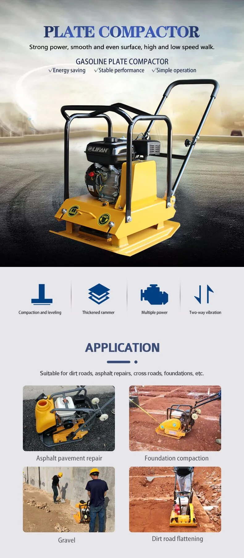 Plate compactor can prevent various structural problems such as cracking and leaking walls, foundation erosion, slab issues, and breakage in pipes and improve construction quality. The machine is often used in the small building foundation, various backfill construction, and earth foundation compaction. Suitable for materials with low adhesion and friction between rammed particles, especially for non-viscous sand. The compaction effect of crushed stone is remarkable.
