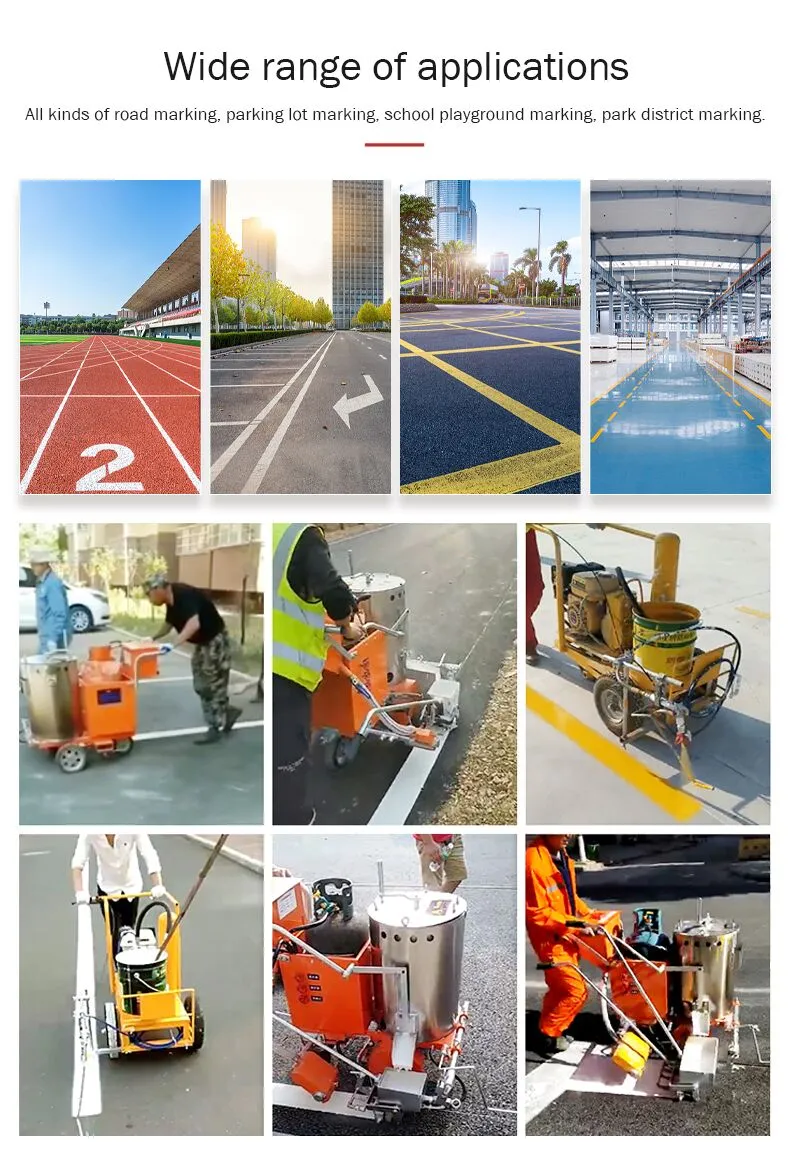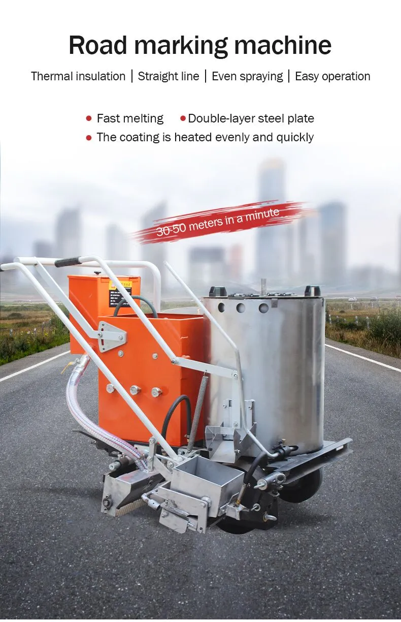 A thermoplastic road marking machine is the key equipment used in thermoplastic road marking construction, it needs to work together with a thermoplastic preheater. The marking shoe is made of high-precision cast iron, which can make the road line order, uniform thickness, and more beautiful. The grounded knife of marking shoes can adapt to different kinds of roads. The glass beads dispenser can dispense glass beads automatically. The paint tank has a double layer of stainless steel, which can keep warm and insulate against heat, it can help save energy and avoid form scalding. The machine has the advantage of high efficiency, high quality, easy to operate, and convenient for maintenance.